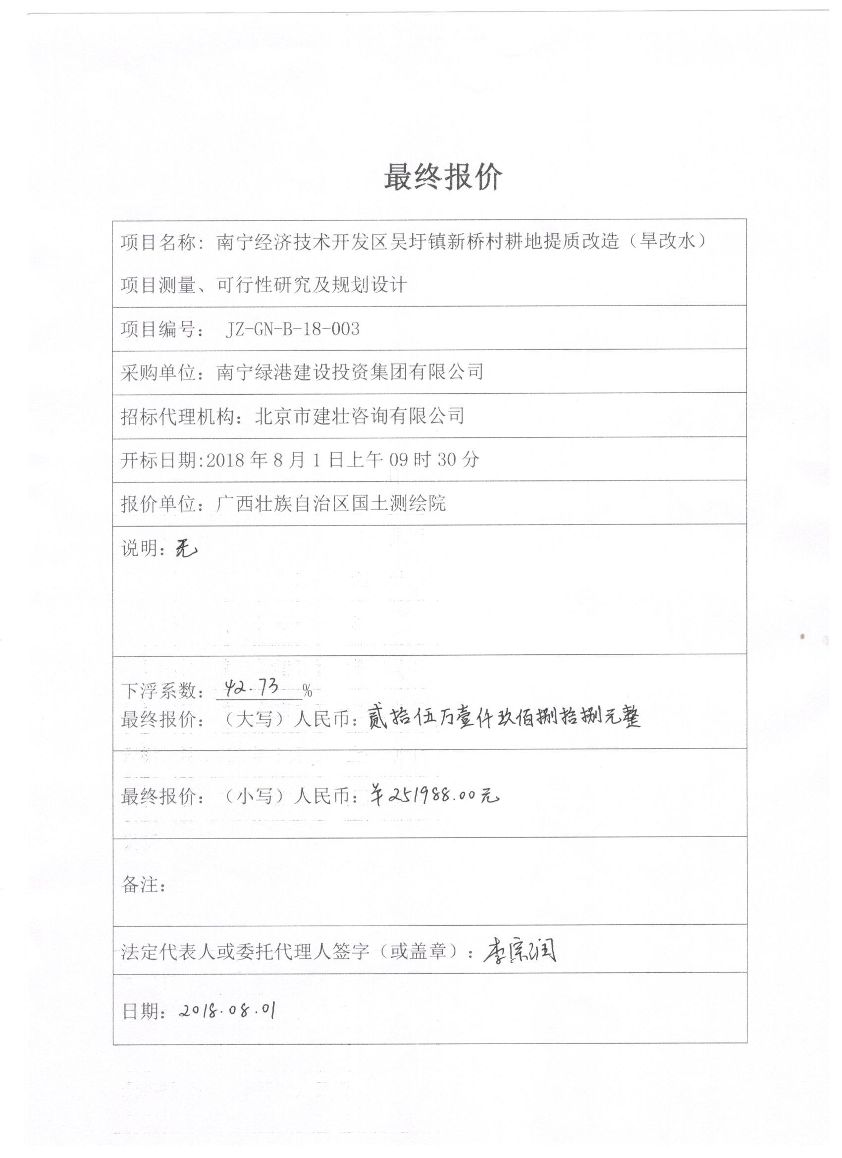 北京市建壯咨詢有限公司受南寧綠港建設(shè)投資集團(tuán)有限公司委托,根據(jù)《中華人民共和國政府采購法》等有關(guān)規(guī)定,于2018年8月1日就南寧經(jīng)濟(jì)技術(shù)開發(fā)區(qū)吳圩鎮(zhèn)新橋村耕地提質(zhì)改造(旱改水)項(xiàng)目測量、可行性研究及規(guī)劃設(shè)計(jì)以競爭性磋商方式進(jìn)行采購,現(xiàn)就本次采購的成交結(jié)果公告如下: