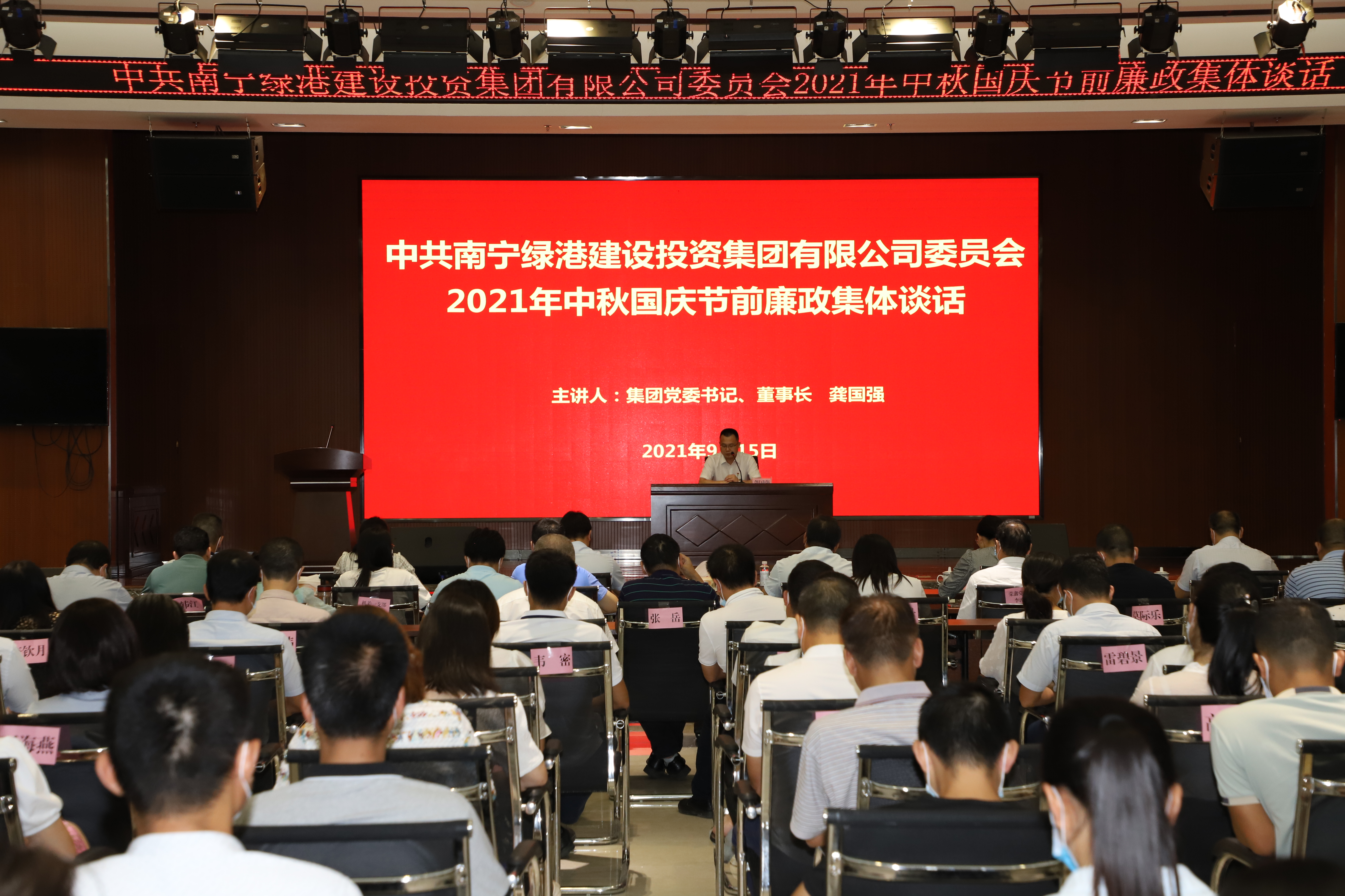 近日,綠港集團(tuán)黨委組織召開(kāi)2021年中秋國(guó)慶節(jié)前廉政集體談話會(huì)。集團(tuán)黨委書記、董事長(zhǎng)龔國(guó)強(qiáng)出席會(huì)議并作廉政集體談話。集團(tuán)領(lǐng)導(dǎo)班子全體成員、集團(tuán)各部門及各子公司中層副職以上人員參加會(huì)議。